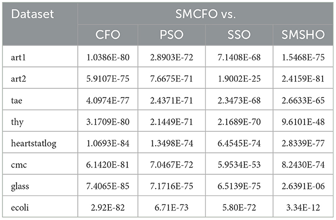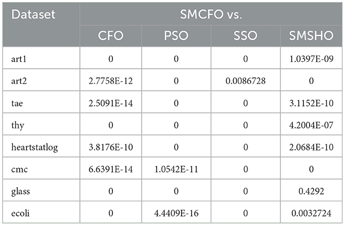 The statistical inference was based on the mean values reported in Tables 2–15. A p-value was calculated for every pairwise comparison between the proposed SMCFO approach and the four baseline methods: CFO, PSO, SSO, and SMSHO. The p-value quantifies the probability of achieving the observed outcome under the null hypothesis that there is no statistically significant difference between the mean performance of the two algorithms. A smaller p-value provides more substantial evidence against the null hypothesis.