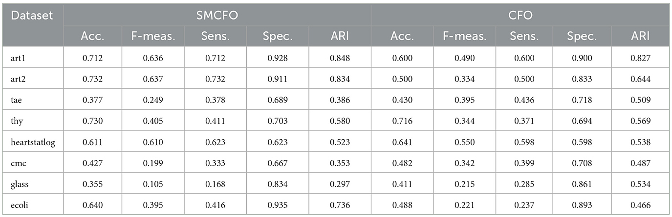The proposed SMCFO algorithm is compared with the original CFO approach using eight benchmark datasets to evaluate clustering performance. The evaluation relied on standard clustering performance metrics, including accuracy, F-measure, sensitivity (detection rate), specificity, and adjusted Rand index (ARI). Table 24 shows that the SMCFO algorithm consistently outperformed CFO across most datasets, particularly in accuracy, where it achieved higher values on seven out of eight datasets, such as 0.7317 on art2 compared to CFO's 0.5. SMCFO continually enhanced precision-recall trade-offs and better identified positive cluster assignments, especially in datasets such as art1 and heartstatlog, echoing the same trends in F-measure and sensitivity. Though both algorithms retained high specificity, SMCFO performed better on datasets such as glass and ecoli, efficiently eliminating false positives. In terms of clustering agreement, ARI scores were consistently higher with SMCFO, indicating greater alignment with ground truth labels–for example, art1 (0.8481 vs. 0.8269), art2 (0.8345 vs. 0.6437), and ecoli (0.7362 vs. 0.4658). These results demonstrate that the modifications introduced in SMCFO enhance clustering quality, stability, and convergence, particularly in datasets characterized by complexity or imbalance.