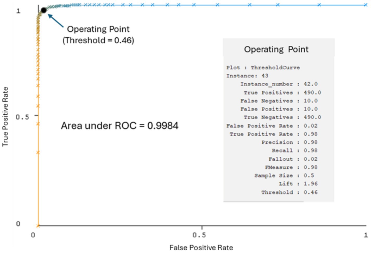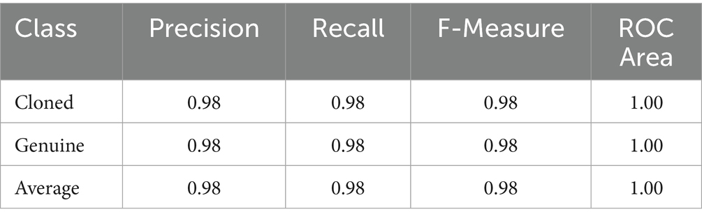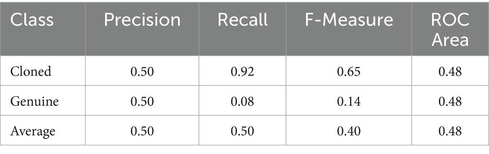 A Random Forest model was implemented in the WEKA toolkit (version 3.8.6; Hall et al., 2009). The model was trained using 5,399 genuine and 5,399 cloned samples from the DEEP-VOICE dataset and evaluated on an additional 500 genuine and 500 cloned samples. The results obtained (Figure 1; Table 2) suggest that MFCCs may be a promising tool for detecting cloned voices.
