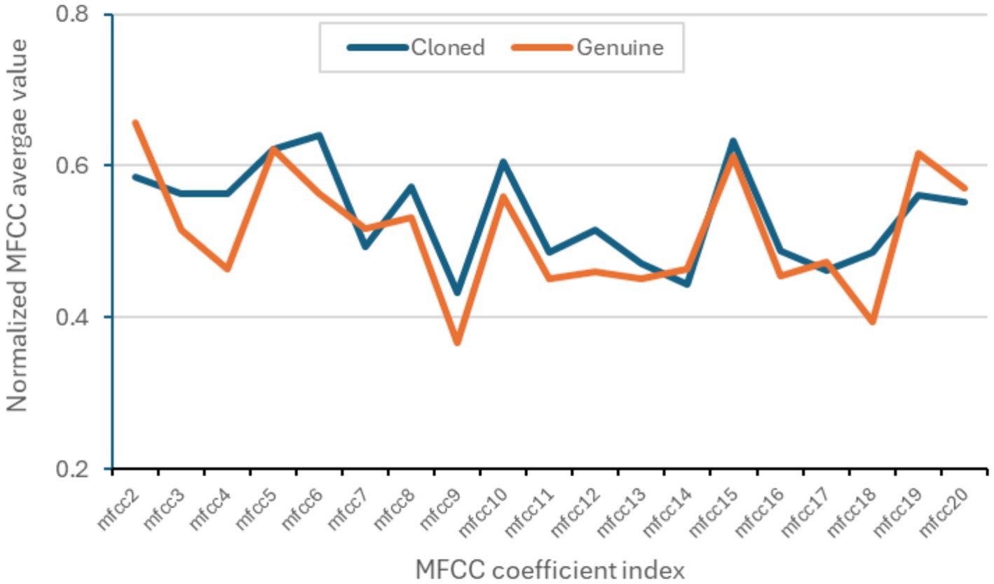 Figure 2. Average values of the MFCC coefficients from 5,889 genuine recordings and 5,889 cloned recordings from the DEEP-VOICE dataset.