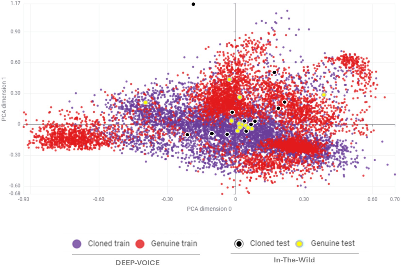 Figure 3. MFCC feature distribution (2D PCA) of genuine and cloned samples from DEEP-VOICE and in-the-wild datasets.