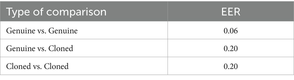 It is worth noting that the EER obtained when comparing cloned recordings is similar to that obtained when comparing original and cloned recordings, although the former comparisons do not arise in forensic casework, where there is always control over the reference recordings (known samples).