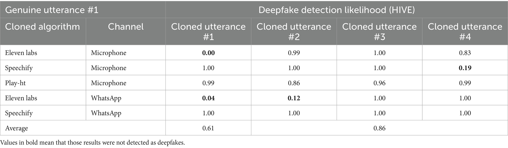 As shown in Table 4, the results of the HIVE detector for four cloned utterances generated using different algorithms and channels indicate poor performance when the cloned utterance is identical to the genuine utterance (a scenario of limited relevance in forensic cases). On average, the detection likelihood is 0.61; however, it is notably lower when the cloning algorithm used is ElevenLabs. Conversely, when the cloned utterance differs from the genuine one — the scenario of primary forensic interest — the likelihood of detection increases to an average of 0.86. The system correctly identified all four genuine utterances.