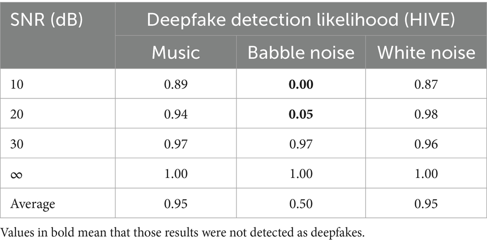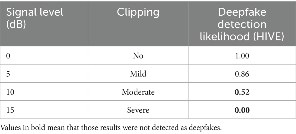 In this experiment, a cloned utterance was amplified to generate different levels of clipping in order to analyze their effect on the HIVE deepfake detector. The results (Table 6) show that only moderate and high levels of clipping affect the detection of cloned utterances. HIVE correctly identified all four genuine utterances, under the same levels of clipping.