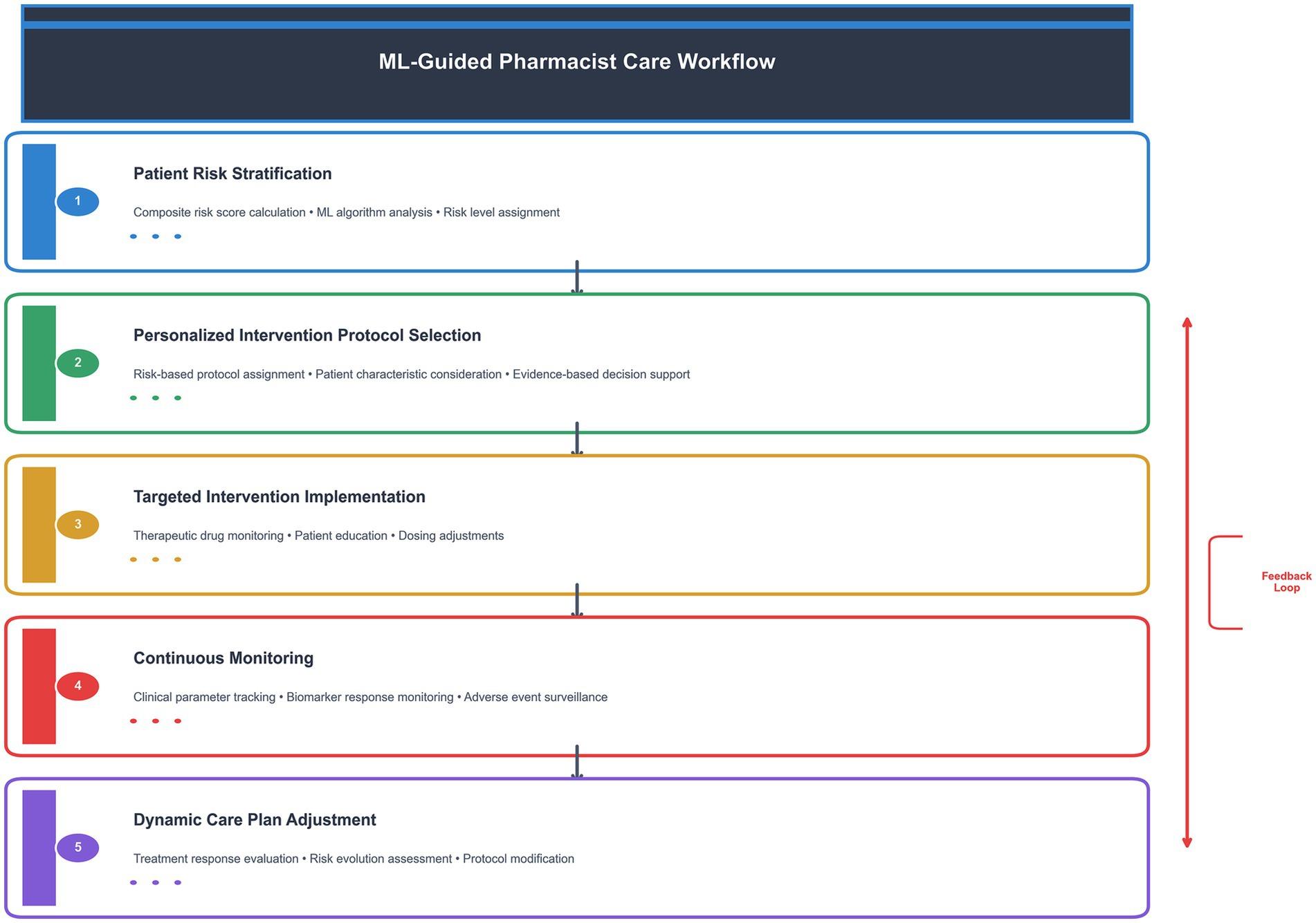 Figure 1. ML-guided pharmacist care workflow. This diagram illustrates the five-step process of ML-guided pharmacist care, from initial risk stratification to dynamic care plan adjustment. The feedback loop ensures continuous optimization of patient care based on treatment response and risk evolution.