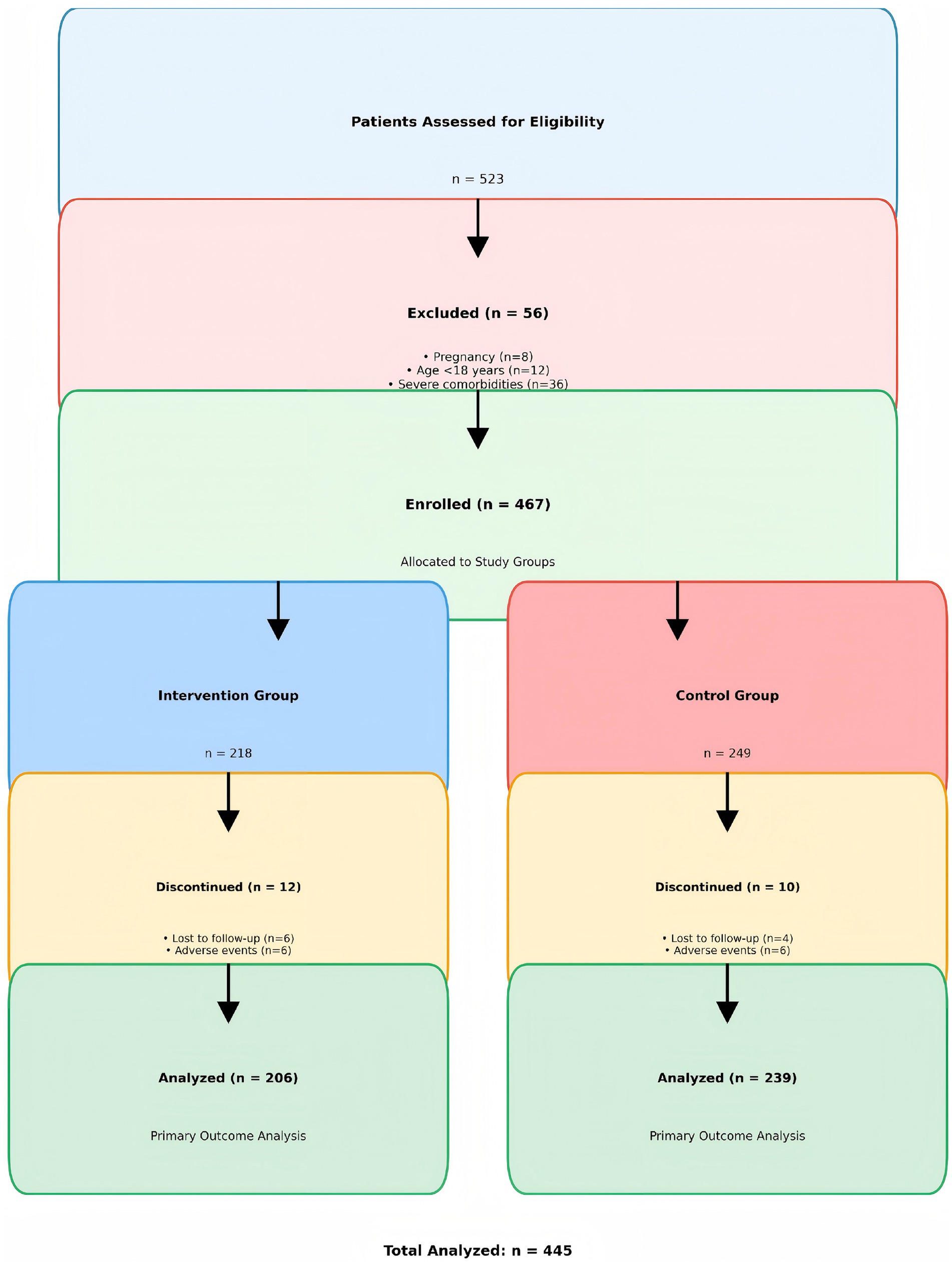 A total of 523 patients were assessed for eligibility. Fifty-six patients were excluded (pregnancy: n = 8, age <18 years: n = 12, severe comorbidities: n = 36). The remaining 467 patients were enrolled and allocated to the intervention group (n = 218) or control group (n = 249). Twenty-two patients discontinued the study (intervention group: n = 12, control group: n = 10), leaving 445 patients for the final analysis (see Figure 2).