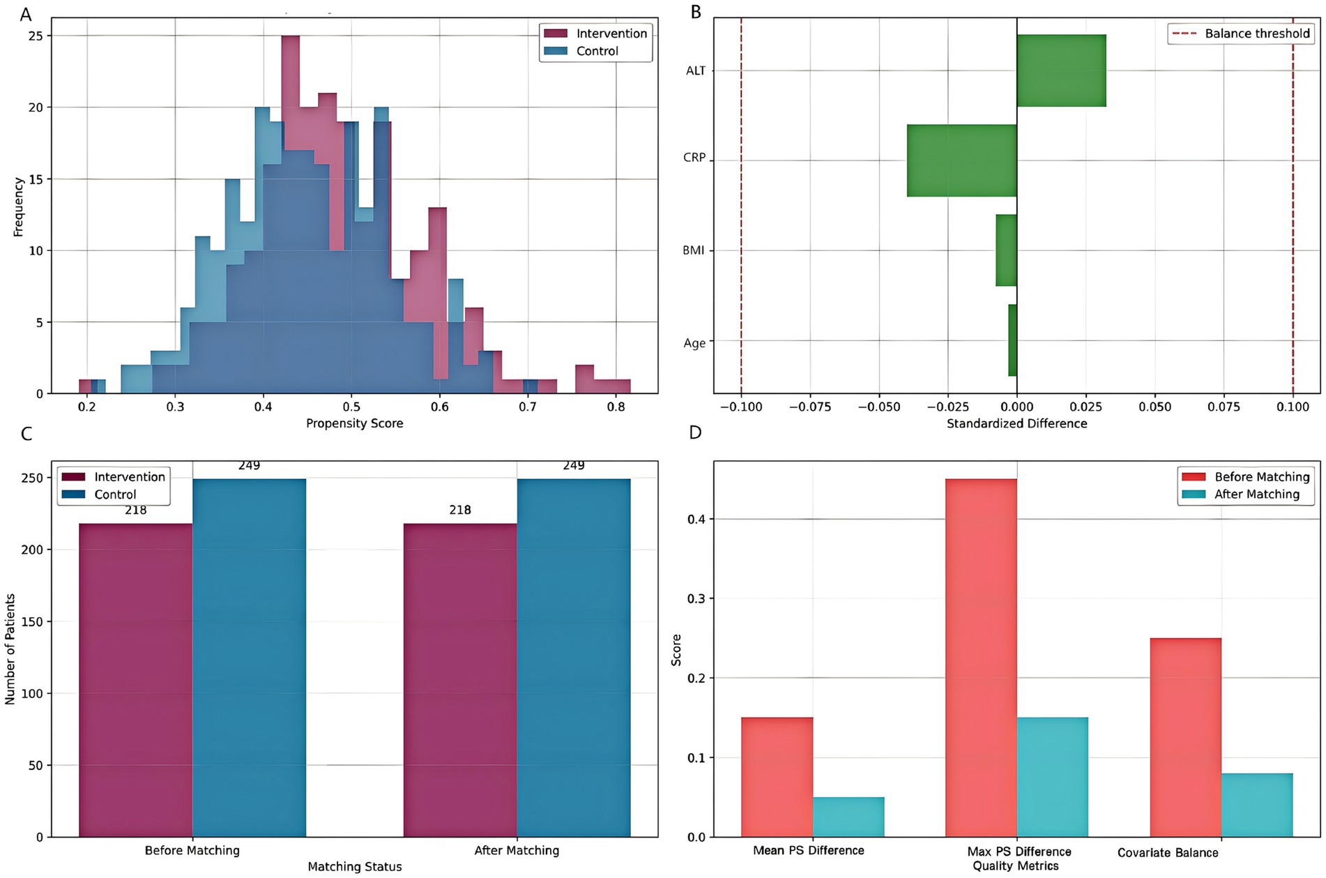 Figure 3. Propensity score matching analysis. (A) Distribution of propensity scores for intervention and control groups. (B) Standardized differences for key covariates before and after matching. (C) Sample size before and after matching. (D) Matching quality assessment showing improvement in balance metrics after PSM.