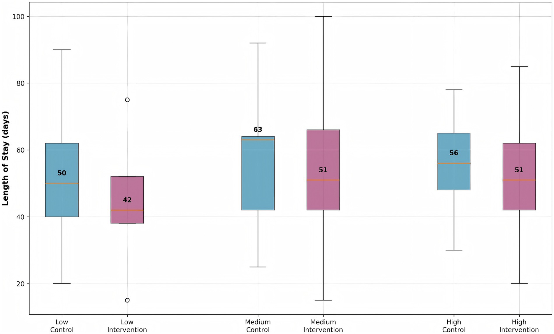 Figure 4. Length of stay distribution by risk group and intervention status. Box plots show median, quartiles, and outliers for each group. The intervention group consistently shows reduced length of stay across all risk strata compared to the control group.