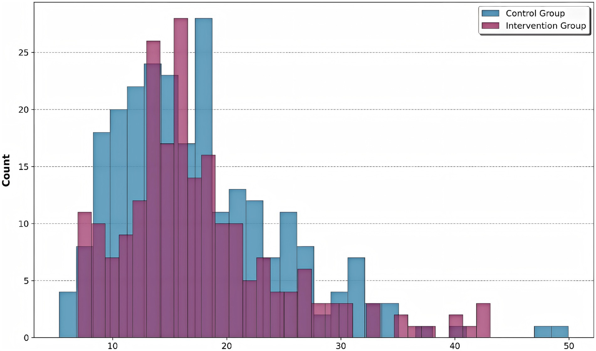 Figure 5. Risk score distribution by group. Histogram shows the distribution of composite risk scores for control (blue) and intervention (purple) groups. The intervention group showed a significant leftward shift in risk score distribution compared to controls, indicating effective risk mitigation through precision pharmacist interventions.