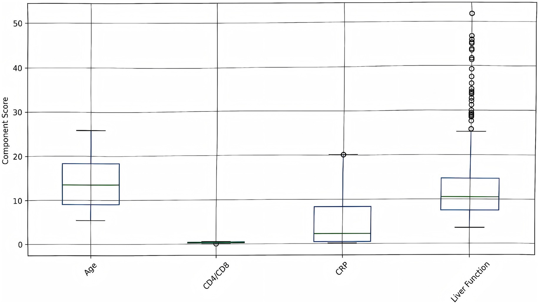 Figure 6. Risk score components analysis. Box plots show the distribution of individual risk components (age, CD4/CD8 ratio, CRP, liver function) across all patients. Higher values indicate increased risk contribution to the overall risk score.