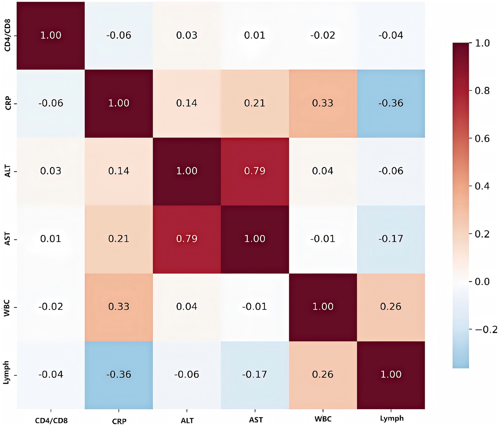 Figure 7. Correlation heatmap of key biomarkers. Values represent Pearson correlation coefficients, with red indicating positive correlations and blue indicating negative correlations. Strong correlations are observed between liver function markers (ALT, AST) and inflammatory markers (CRP).