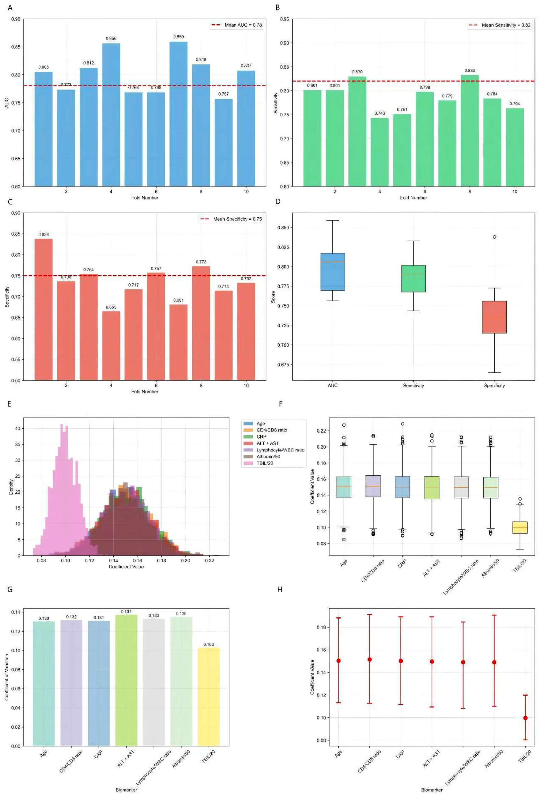 Figure 8. 10-fold cross-validation results for biomarker panel and bootstrap analysis results (1,000 iterations). (A) AUC distribution across 10 folds showing consistent performance (mean AUC: 0.78 ± 0.05). (B) Sensitivity distribution demonstrating high sensitivity for risk detection (mean: 0.82 ± 0.04). (C) Specificity distribution showing moderate specificity (mean: 0.75 ± 0.06). (D) Performance metrics distribution across all folds, indicating stable model performance. (E) Distribution of risk score coefficients across bootstrap samples, showing consistent parameter estimates. (F) Coefficient stability box plots demonstrating low variability. (G) Coefficient of variation for each biomarker, all below 0.15 indicating high stability. (H) 95% confidence intervals for all coefficients, showing narrow intervals and robust parameter estimates.