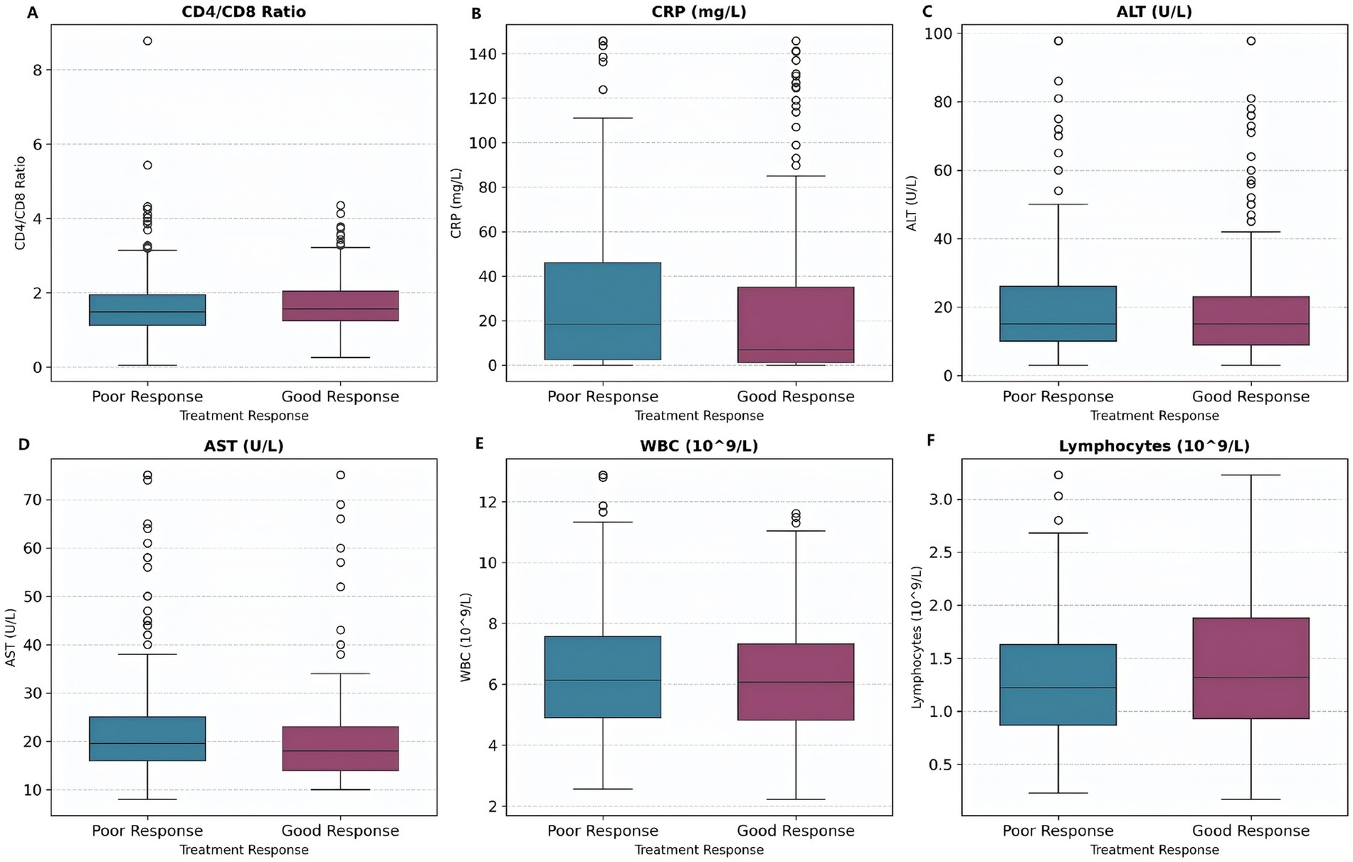 Figure 9. Biomarker levels by treatment response. Box plots show biomarker distributions for patients with good response (shorter hospital stay) versus poor response (longer hospital stay). Patients with good response tend to have lower CRP and liver enzyme levels. (A) CD4/CD8 Ratio. (B) CRP levels. (C) ALT levels. (D) AST levels. (E) WBC counts. (F) Lymphocyte counts.