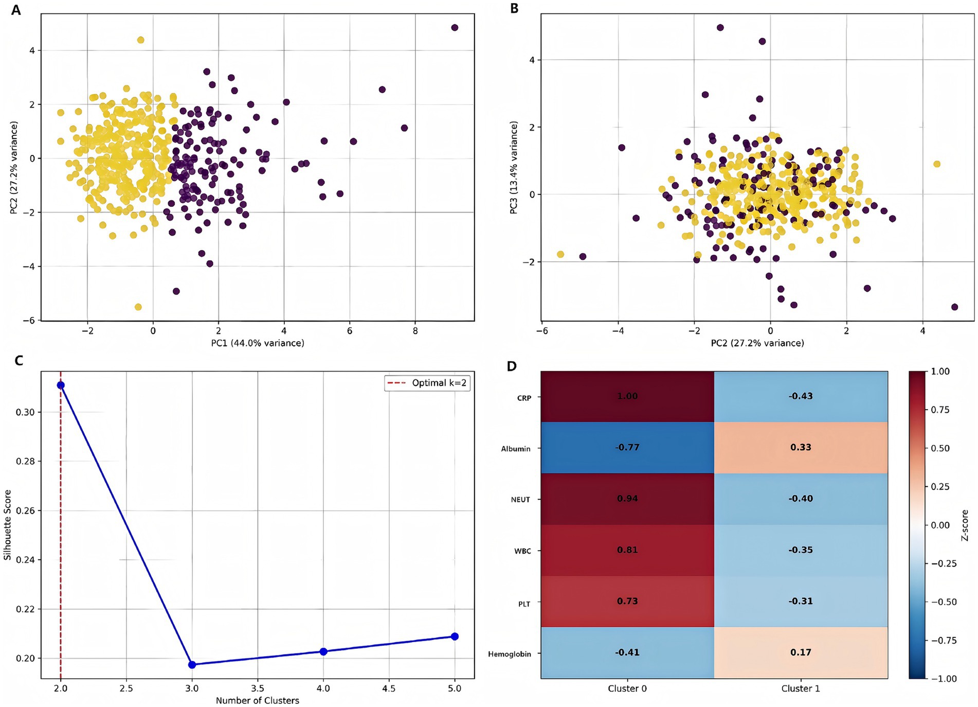Figure 10. Patient stratification using machine learning. (A) Distribution of patients in PC1-PC2 space colored by subtype. (B) PC2-PC3 projection showing cluster separation. (C) Silhouette analysis demonstrating optimal cluster number determination. (D) Feature importance heatmap for cluster characterization [values represent standardized scores (z-scores) for each clinical parameter. Red indicates higher than average values, blue indicates lower than average values].