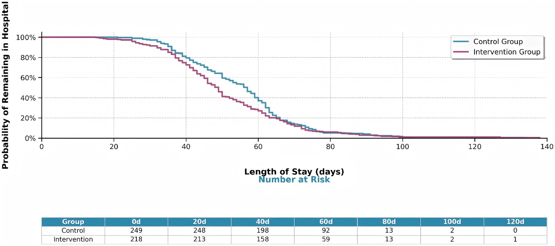 Figure 11. Kaplan–Meier survival curves showing hospital stay duration by intervention group. The intervention group (orange line) shows significantly shorter hospital stays compared to the control group (blue line) (log-rank p = 0.040). The table below shows the number of patients at risk at key time points (0, 20, 40, 60, 80, 100, 120 days).