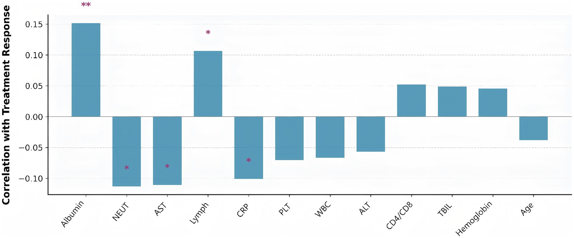 Figure 12. Clinical parameters correlated with treatment response (defined as hospital length of stay below the median). Bar height represents correlation strength, with positive correlations indicating better treatment response. Asterisks indicate statistical significance levels (*p < 0.05, **p < 0.01, ***p < 0.001). Albumin showed the strongest positive correlation with good treatment response, while neutrophil count and AST were negatively correlated.