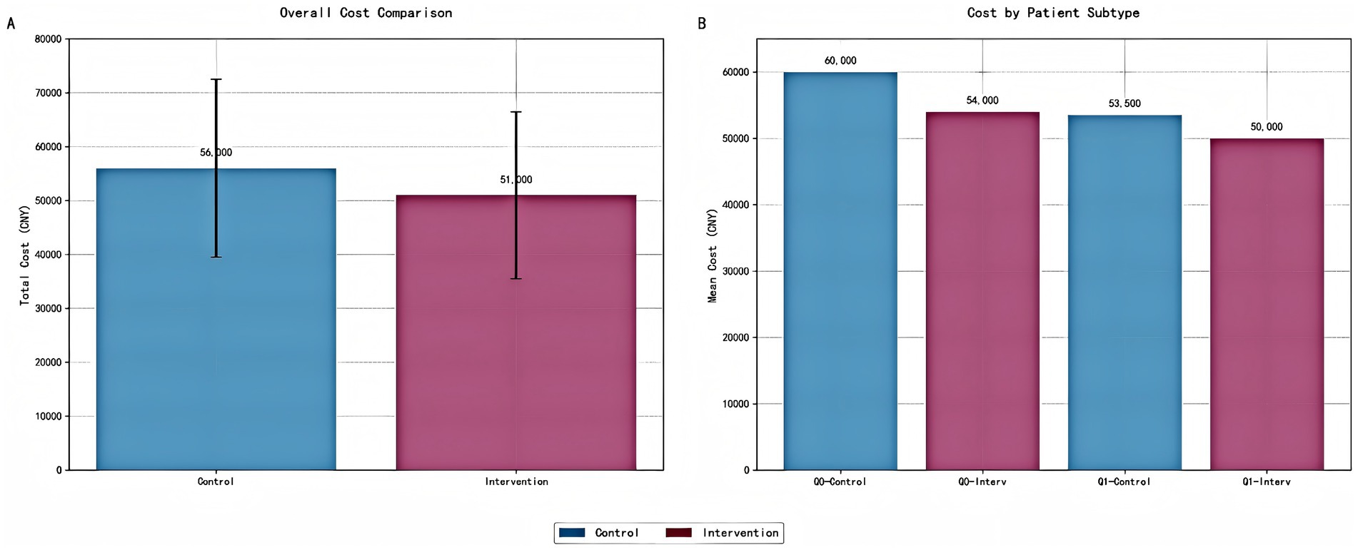 Figure 13. Cost analysis of precision pharmacist interventions by intervention group and patient subtype. (A) Bar chart comparing the total cost (mean ± standard deviation) between the control and intervention groups. Error bars represent one standard deviation. The intervention group demonstrates a significant reduction in total cost per patient. (B) Bar chart illustrating the cost analysis stratified by patient risk subtypes (Q0: high-risk; Q1: low-risk). The intervention group shows reduced costs across all risk categories, with the most substantial savings observed in the high-risk subgroup (Q0). All costs are presented in Chinese Yuan (CNY).