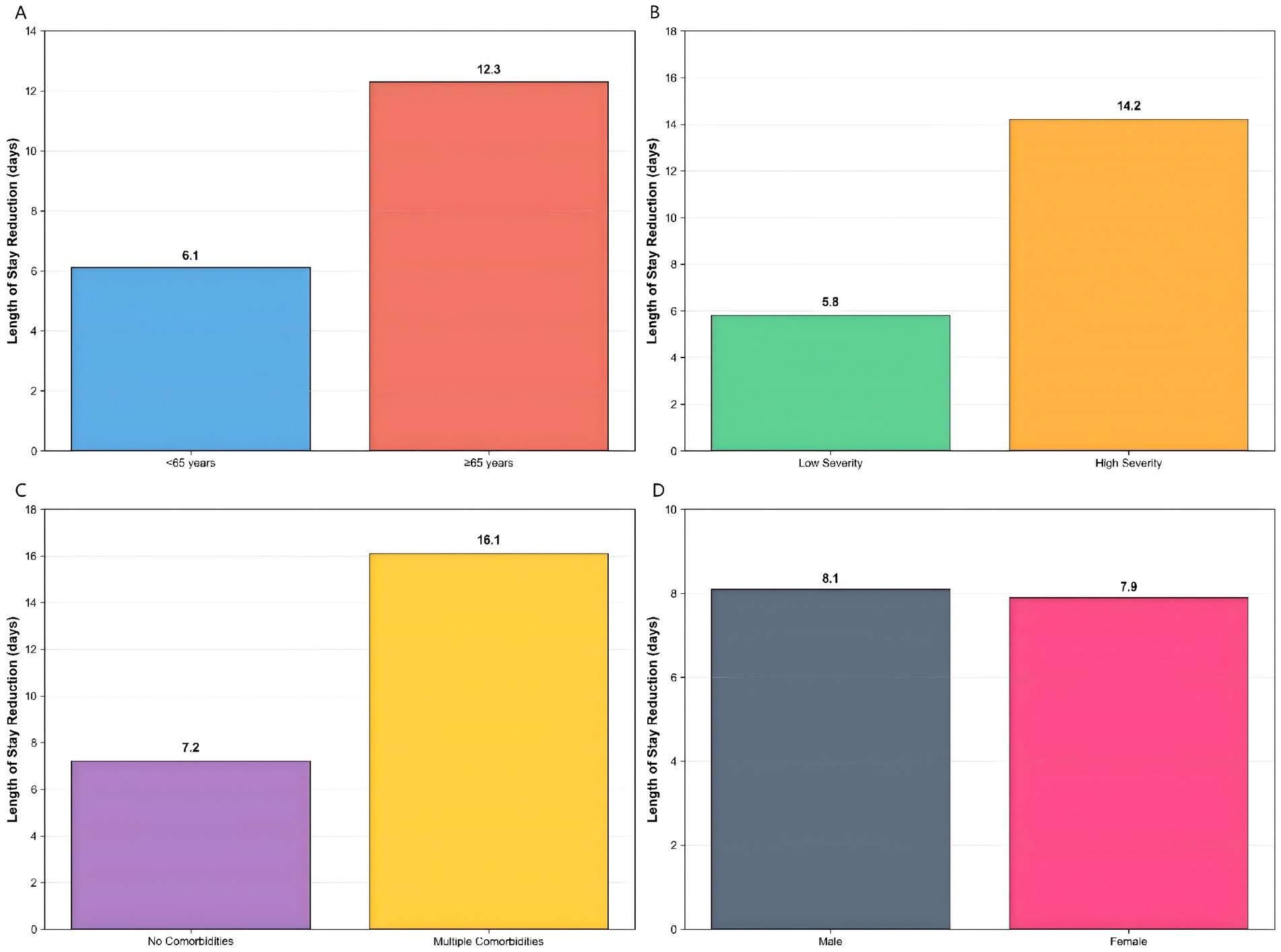 The most striking differential effect was observed according to comorbidity status. Patients with multiple comorbidities experienced the largest improvement, with a 16.1-day reduction in hospitalization (p < 0.001), while those without comorbidities showed a more modest 7.2-day reduction (p = 0.01). In contrast, gender-based analysis showed nearly identical benefits for both male and female patients (8.1 vs. 7.9 days, p = 0.85), indicating consistent effectiveness across sex subgroups.
