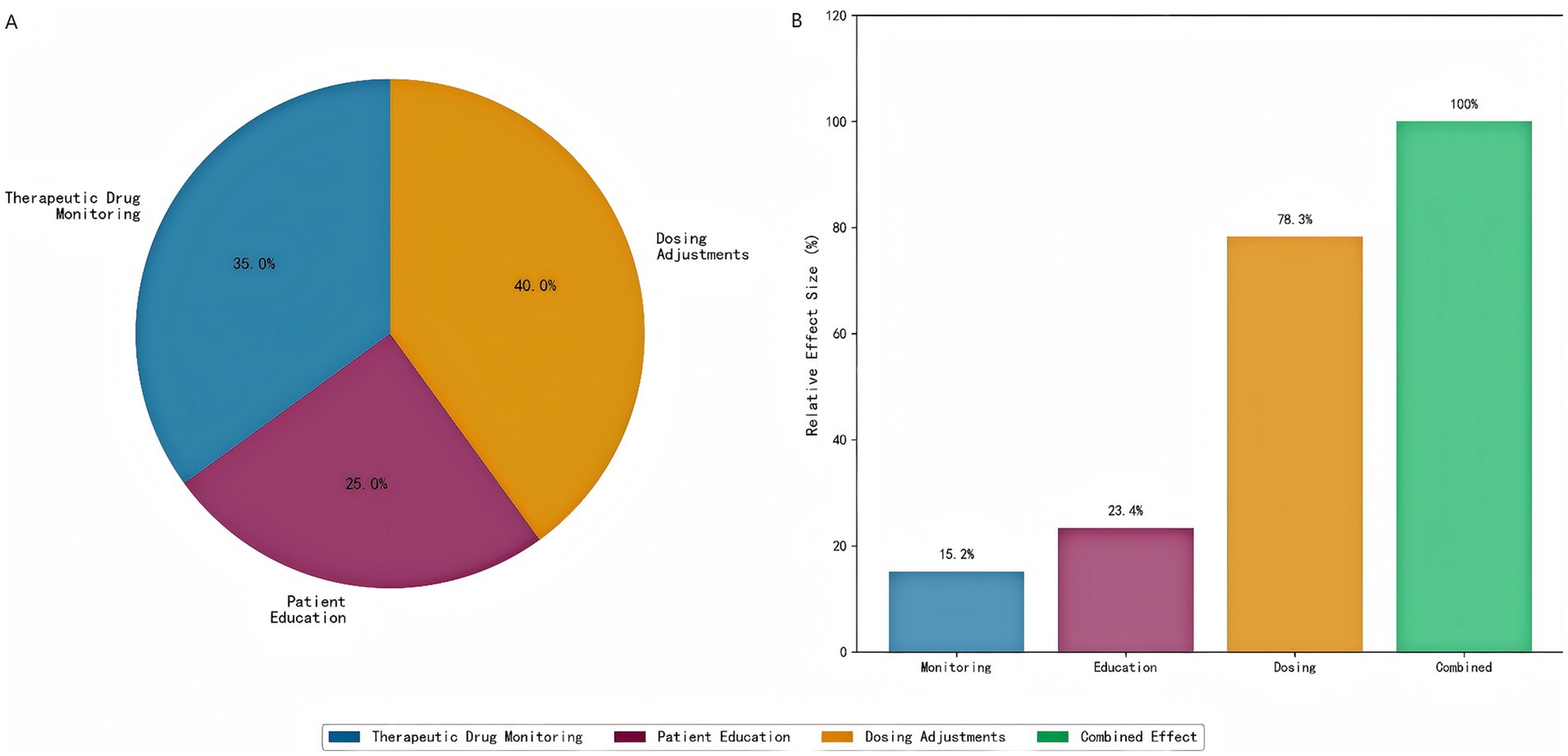 Figure 15. Intervention component analysis. (A) Individual component contributions to clinical benefit, showing that dosing adjustments contribute the most (40%), followed by therapeutic drug monitoring (35%) and patient education (25%). (B) Component-specific outcomes demonstrating the relative effectiveness of each intervention element.