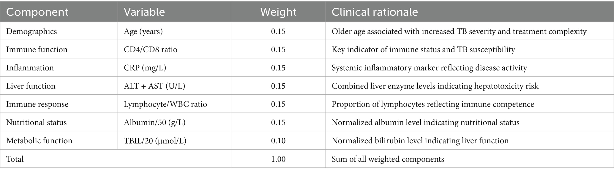 Inclusion criteria: (1) Patients diagnosed with pulmonary tuberculosis according to standardized diagnostic criteria (Khan et al., 2023); (2) Mycobacterium tuberculosis-positive as confirmed by smear, culture, or molecular methods (GeneXpert MTB/RIF, DNA/RNA amplification, melting curve analysis, etc.); (3) no prior anti-tuberculosis treatment; and (4) undergoing intensive-phase first-line anti-TB therapy.