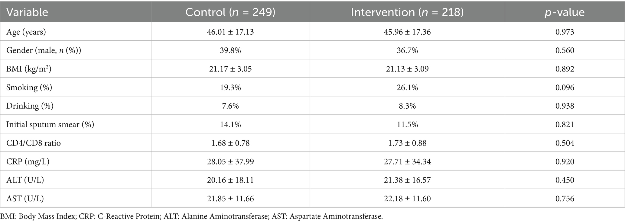 The study included 467 adult TB patients, with 218 receiving personalized clinical pharmacist interventions and 249 receiving standard care. The baseline demographic and clinical characteristics of the 467 enrolled patients before propensity score matching (PSM) are shown in Table 2.