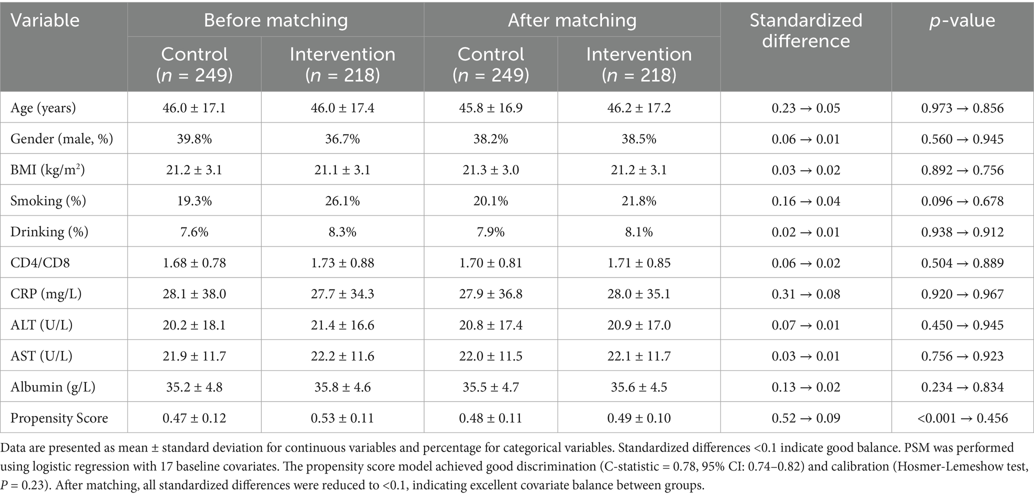 Propensity scores were calculated using logistic regression with the following baseline covariates: age, gender, BMI, smoking status, alcohol consumption, CD4/CD8 counts, complete blood count parameters (WBC, lymphocyte, neutrophil, platelet counts), liver function markers (ALT, AST, albumin, total bilirubin), inflammatory markers (CRP), and hemoglobin levels. The propensity score model achieved good discrimination (C-statistic = 0.78, 95% CI: 0.74–0.82) and calibration (Hosmer-Lemeshow test, p = 0.23). Standardized differences were calculated to assess covariate balance, with values <0.1 indicating good balance. The final matched cohort included 467 patients with balanced baseline characteristics between groups.