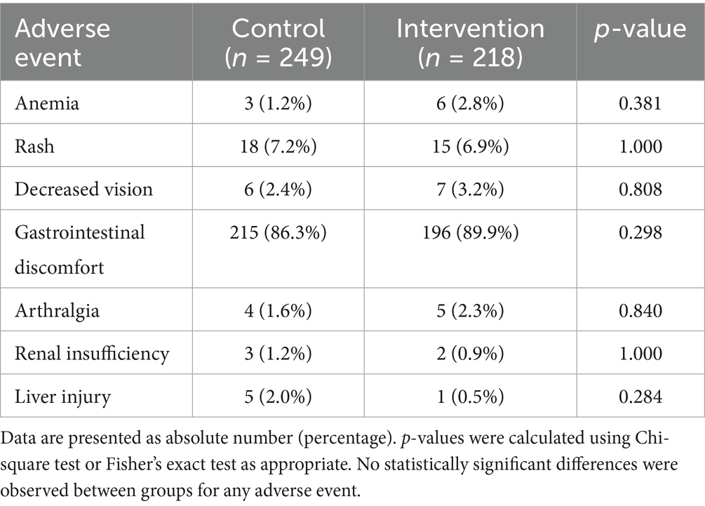 Table 4 summarized the incidence of major adverse events in the control and intervention groups. The safety analysis revealed comparable adverse event rates between groups, with gastrointestinal discomfort being the most frequent event in both arms (control: 86.3% vs. intervention: 89.9%, p = 0.298). No statistically significant differences were observed for any individual adverse event (all p > 0.28), though a non-significant trend favored the intervention group for hepatotoxicity reduction (2.0% vs. 0.5%, p = 0.284). The overall safety profile suggested that personalized pharmacist interventions did not increase adverse events. However, the observed, non-significant trend toward a reduction in severe hepatic complications is a promising finding that warrants further investigation in larger studies to confirm its validity.