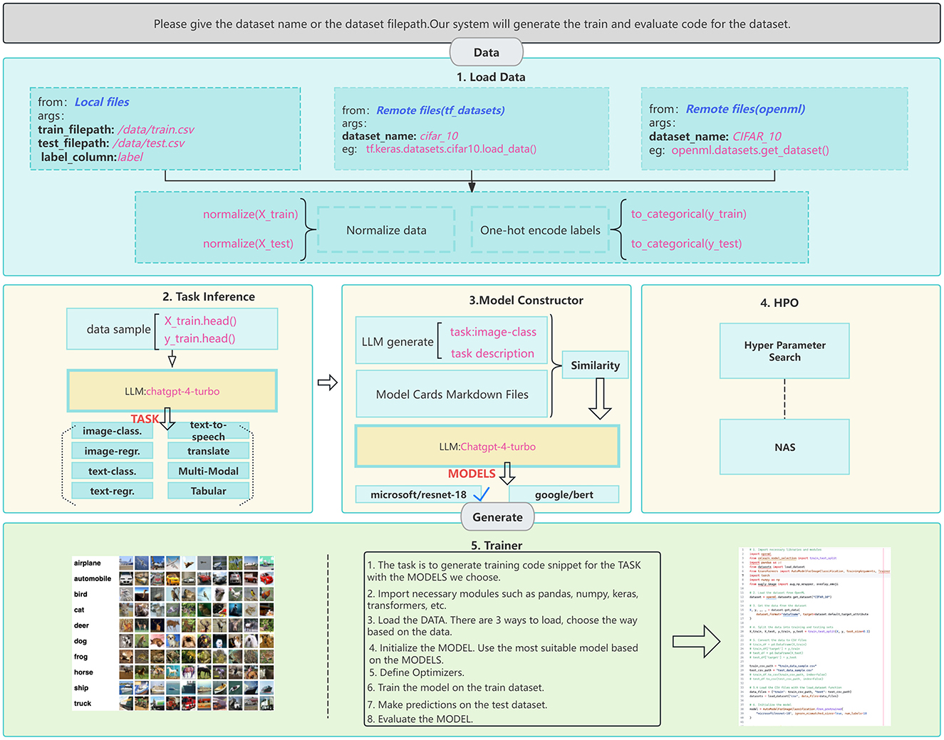 Our framework utilizes carefully designed prompts that guide the LLM in generating appropriate code for each unique combination of data, task, and model. For instance, when dealing with a dataset like CIFAR-10, we first instruct the LLM to generate training and evaluation code specifically for the given task and model. Specifically, the LLM begins by importing essential libraries and modules, such as pandas, numpy, keras, sklearn, and task-specific libraries like transformers for NLP tasks. Next, the code for data loading is generated, accommodating the various data sources supported by our system (local files, TensorFlow datasets, or OpenML datasets). The LLM adapts this step based on the specific data loading method used in earlier stages. The model initialization follows, with the LLM generating code to instantiate the selected model architecture. The LLM then defines appropriate optimizers and loss functions, tailoring these choices to the specific task and model architecture. This includes generating code for custom loss functions if required by the task. For the training process, the LLM produces code that efficiently trains the model on the provided dataset. This includes setting up training loops, implementing batch processing, and incorporating any necessary callbacks or learning rate schedules. Finally, the LLM generates code for model evaluation, including making predictions on the test set and calculating relevant performance metrics.