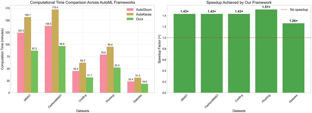 Beyond performance improvements, computational efficiency represents an important factor in practical AutoML deployment. We conducted a timing analysis to evaluate the computational overhead of our LLM-based approach compared to traditional rule-based AutoML frameworks. Figure 2 presents the computational time comparison across five representative datasets, measuring the complete end-to-end pipeline execution from data loading to final model evaluation, we compare the speed up to AutoKeras. The results demonstrate that our LLM-based framework achieves substantial computational efficiency gains across all evaluated datasets. The absolute computation times, shown in the left panel of Figure 2, reveal consistent reductions compared to both AutoGluon and AutoKeras. For instance, on the MNIST dataset, our framework requires only 87.2 min compared to AutoGluon's 124.3 min and AutoKeras's 156.7 min. Similarly, for the Credit-g dataset, our method completes the pipeline in 31.7 min, substantially faster than AutoGluon (45.2 min) and AutoKeras (62.3 min). The speedup analysis, presented in the right panel of Figure 2, quantifies these efficiency improvements. Our framework achieves speedup factors ranging from 1.26× to 1.51× across different datasets, with the most significant acceleration observed on the Phishing dataset (1.51× speedup). The consistent speedup across diverse datasets indicates that the efficiency gains are not dataset-specific but rather stem from fundamental architectural advantages of our approach.