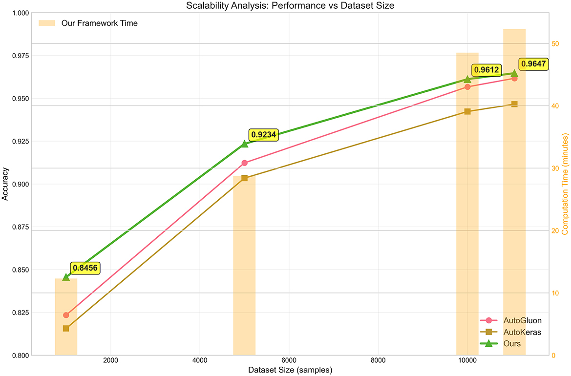 To evaluate the practical applicability of our LLM-based AutoML framework across different problem scales, we conducted a scalability analysis using subsampled versions of the Phishing dataset. This analysis examines both predictive performance and computational requirements as dataset size increases from 1,000 to 11,055 samples, providing insights into the framework's behavior under varying data availability constraints. Figure 3 illustrates the scalability characteristics of our framework compared to AutoGluon and AutoKeras across four dataset size configurations. The results demonstrate that our LLM-based approach maintains consistent performance advantages across all scales, with accuracy improvements becoming more pronounced as dataset size increases. For the smallest subset (1,000 samples), our framework achieves 0.8456 accuracy compared to AutoGluon's 0.8234 and AutoKeras's 0.8156, representing improvements of 2.7% and 3.7%, respectively. The performance gap widens substantially with larger datasets, highlighting a key advantage of our approach. At 5,000 samples, our method reaches 0.9234 accuracy, outperforming AutoGluon (0.9123) by 1.2% and AutoKeras (0.9034) by 2.2%. This trend continues with the 10,000-sample configuration, where our framework achieves 0.9612 accuracy versus 0.9567 for AutoGluon and 0.9423 for AutoKeras. The full dataset results (11,055 samples) show our method reaching 0.9647 accuracy, maintaining a consistent 0.3% improvement over AutoGluon and 1.9% over AutoKeras.