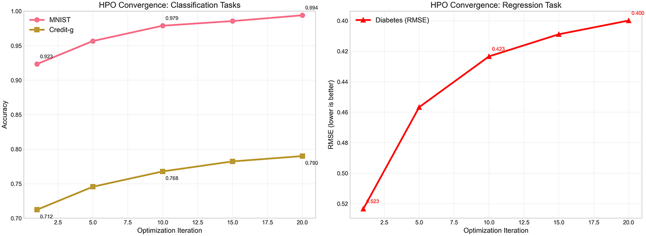 Figure 4. Hyperparameter optimization convergence trajectories across representative tasks. (Left) Displays accuracy improvement over 20 optimization iterations for classification tasks: MNIST (pink line) and Credit-g (brown line). (Right) Shows RMSE reduction for the Diabetes regression task (red line with triangular markers). Key performance milestones are annotated to highlight convergence characteristics. The plots demonstrate rapid initial improvements followed by gradual refinement, with our LLM-enhanced HPO strategy achieving near-optimal performance within 15 iterations across all task types.