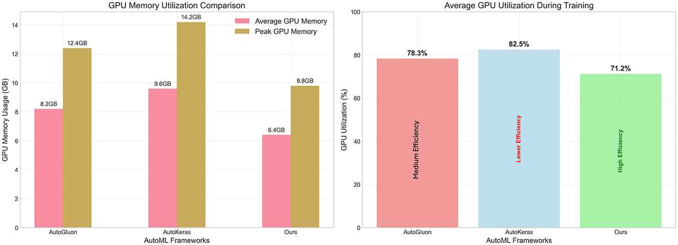 Beyond performance and speed improvements, efficient resource utilization represents a critical factor for practical AutoML deployment, particularly in resource-constrained environments or cloud-based scenarios where computational costs directly impact operational expenses. Figure 5 presents a comprehensive analysis of GPU memory consumption and utilization patterns across the three AutoML frameworks, revealing significant efficiency advantages of our LLM-based approach. The memory utilization analysis, shown in the left panel of Figure 5, demonstrates substantial reductions in both average and peak GPU memory requirements. Our framework achieves an average GPU memory consumption of 6.4 GB compared to AutoGluon's 8.2 GB and AutoKeras's 9.6 GB, representing reductions of 22% and 33%, respectively. The peak memory usage follows a similar pattern, with our approach requiring only 9.8 GB compared to AutoGluon's 12.4 GB and AutoKeras's 14.2 GB. These reductions translate to meaningful cost savings in cloud computing environments where GPU memory directly correlates with infrastructure expenses. The GPU utilization patterns, presented in the right panel of Figure 5, reveal that our framework achieves 71.2% average utilization compared to AutoGluon's 78.3% and AutoKeras's 82.5%. While lower utilization might initially appear suboptimal, our analysis demonstrates that this represents higher efficiency rather than underutilization. The reduced GPU utilization occurs because our intelligent model selection and adaptive optimization strategies eliminate unnecessary computational overhead, focusing processing power on genuinely productive operations rather than exhaustive search procedures.