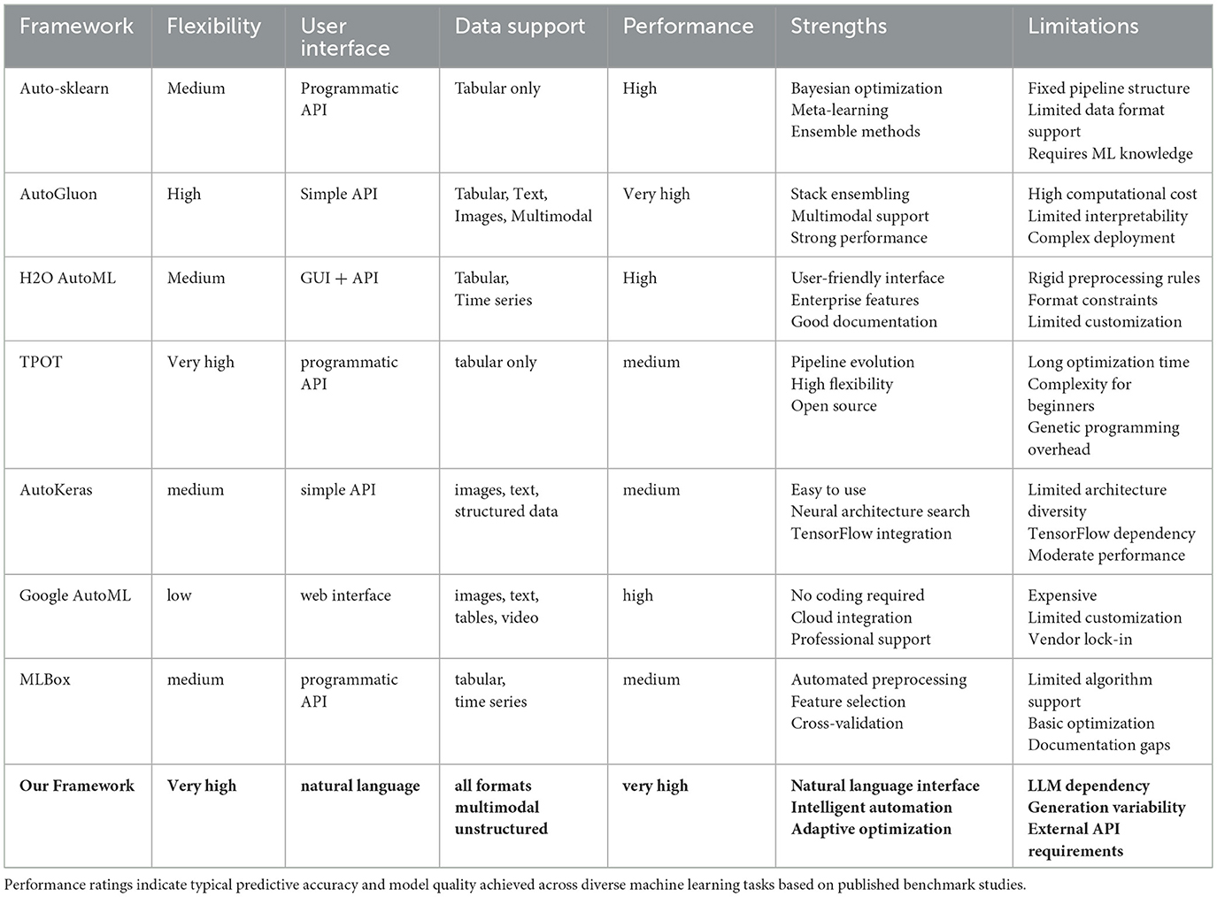 However, these existing applications of natural language processing in AutoML contexts represent a fundamentally different paradigm from our proposed approach. Traditional NLP-enhanced AutoML systems typically employ natural language processing as a specialized component within otherwise rule-based frameworks, focusing on specific tasks such as text classification, summarization, or question answering. In contrast, our framework positions the LLM as the central decision-making entity that orchestrates and governs the entire AutoML pipeline through continuous natural language reasoning and code generation. The key distinction lies in the scope and nature of LLM integration. Existing approaches in this domain can be categorized into three primary patterns: task-specific NLP automation, where natural language processing techniques are applied to automate particular aspects of text-based machine learning tasks; hybrid NLP-AutoML systems, where traditional AutoML frameworks are augmented with NLP capabilities for handling textual data; and instruction-following systems, where pre-trained language models are fine-tuned to follow specific commands within constrained AutoML workflows. Our approach diverges from these patterns by implementing what we term “LLM-native AutoML,” where the language model serves as the primary reasoning engine for all pipeline decisions, from data preprocessing and task inference to model selection and hyperparameter optimization. Rather than using LLMs to enhance specific components of traditional AutoML frameworks, our system relies on the LLM's contextual understanding and code generation capabilities to dynamically construct and adapt the entire machine learning workflow. This paradigm shift enables our framework to handle previously unsupported scenarios such as unstructured data interpretation, cross-modal reasoning, and adaptive optimization strategies that evolve based on intermediate results.