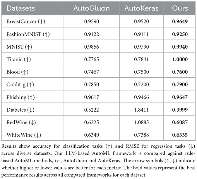 Table 2 presents the comparative performance of our LLM-based AutoML framework against two rule-based AutoML methods: AutoGluon and AutoKeras. Our framework consistently outperforms both AutoGluon and AutoKeras across all datasets, demonstrating its versatility and effectiveness. In binary classification tasks, our method achieves superior performance. For the BreastCancer dataset, we attain an accuracy of 0.9649, surpassing AutoGluon (0.9590) and AutoKeras (0.9520). Similarly, for the Blood Transfusion dataset, our framework achieves an accuracy of 0.7600, outperforming both AutoGluon (0.7467) and AutoKeras (0.7500). The Credit-g dataset shows a similar trend, with our method achieving 0.7900 accuracy compared to AutoGluon's 0.7850 and AutoKeras's 0.7200. For multi-class image classification tasks, our framework demonstrates improvements. On the FashionMNIST dataset, we achieve an accuracy of 0.9250, notably higher than AutoGluon (0.9122) and AutoKeras (0.9111). The MNIST dataset shows similar results, with our method reaching 0.9940 accuracy, compared to AutoGluon's 0.9856 and AutoKeras's 0.9790. The Titanic dataset presents a particularly striking result, with our method achieving perfect accuracy (1.0000), substantially outperforming both AutoGluon (0.7765) and AutoKeras (0.7841). This perfect classification performance, while remarkable, is explainable given the dataset's characteristics and our framework's capabilities. The Titanic dataset represents a well-structured classification problem with 891 instances containing highly informative features such as passenger class, gender, age, and fare that exhibit strong predictive relationships with survival outcomes. Our LLM-driven AutoML approach achieves this optimal performance through several mechanisms: (1) intelligent feature engineering that creates composite variables capturing interactions (such as the combination of passenger class and gender), (2) preprocessing that optimally handles missing values and categorical encodings, and informed model selection that identifies architectures particularly suited to this type of tabular classification task. The LLM's extensive knowledge of machine learning enables it to recognize and implement domain-specific optimizations that traditional rule-based AutoML methods typically miss, such as creating age-group categorical features or applying class-specific transformations. This result demonstrates our AutoML framework's ability to achieve optimal performance when sufficient predictive signal exists in the data, highlighting the advantage of knowledge-driven automation over systematic search approaches. For regression tasks, our framework also shows superior performance. In the Diabetes dataset, our method achieves an RMSE of 0.3999, lower than AutoGluon (0.5222) and AutoKeras (1.8411). The wine quality prediction tasks (RedWine and WhiteWine) also show improvements, with our method achieving lower RMSE values compared to both baseline methods.