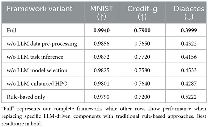 To evaluate the contribution of each component in our LLM-driven AutoML framework, we conducted a comprehensive ablation study across three representative datasets: MNIST (image classification), Credit-g (binary classification), and Diabetes (regression). Table 3 presents the results of replacing each LLM-driven component with traditional rule-based approaches while maintaining all other components intact. The results demonstrate that each LLM-driven component contributes meaningfully to the framework's overall performance. When the LLM-based data pre-processing is replaced with conventional rule-based preprocessing, performance decreases across all datasets, with particularly notable degradation in Credit-g accuracy (dropping from 0.7900 to 0.7650) and Diabetes RMSE (increasing from 0.3999 to 0.4322). This suggests that the LLM's ability to intelligently handle diverse data formats and structures provides substantial benefits over traditional pre-processing methods. The removal of LLM-driven task inference also impacts performance, though to a lesser extent than data preprocessing. This component's contribution is most evident in the Credit-g dataset, where accuracy decreases from 0.7900 to 0.7720, indicating the importance of precise task specification and requirement analysis. Model selection emerges as an important component, with its removal leading to performance degradation across all datasets. The impact is particularly pronounced in the Diabetes dataset, where the RMSE increases from 0.3999 to 0.4533, highlighting the LLM's effectiveness in selecting and configuring appropriate model architectures for specific tasks. The LLM-enhanced hyperparameter optimization also proves valuable, with its removal causing notable performance drops, especially in MNIST (accuracy decreasing from 0.9940 to 0.9801) and Credit-g (accuracy falling to 0.7640). This demonstrates the advantage of combining LLM knowledge with dynamic performance feedback for optimization. Finally, the comparison with a fully rule-based approach (equivalent to traditional AutoML frameworks) shows the largest performance gap, confirming that the integration of LLM capabilities across the entire pipeline provides substantial improvements over conventional AutoML methods. The “rule-based only” configuration required manual reimplementation of traditional AutoML methodologies to ensure functional completeness. We replaced each LLM-driven component with equivalent rule-based approaches: conventional decision trees for preprocessing pipeline selection, fixed heuristics for task classification, predetermined model rankings based on established benchmarks, and grid search optimization with predefined parameter spaces. This reimplementation approach ensures fair comparison by providing functionally complete alternatives rather than simply disabling LLM components, which would create pipeline gaps that could artificially disadvantage the baseline. This ablation analysis reveals that model selection contributes most significantly to performance improvements, particularly for regression tasks where removing this component causes up to 13.4% performance degradation. Data preprocessing emerges as the second most critical component, especially for tabular data where intelligent feature engineering provides substantial benefits over rule-based approaches.