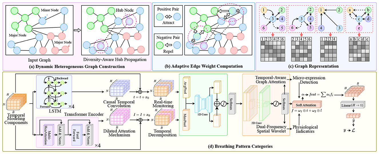Figure 1. Overview of our multimodal dynamic graph network framework for sleep disorder monitoring. The system processes multimodal inputs through: (A) Dynamic heterogeneous graph construction with diversity-aware hub propagation to balance information flow across facial and audio modalities; (B) Adaptive edge weight computation using positive/negative pair attraction-repulsion mechanisms to enhance cross-modal alignment; (C) Graph representation encoding with temporal-aware attention for structural pattern learning; (D) Breathing pattern categorization module integrating LSTM-based temporal modeling, causal convolution for real-time monitoring, dilated attention mechanism for long-range dependencies, dual-frequency spatial wavelet analysis, and micro-expression detection for physiological indicators.