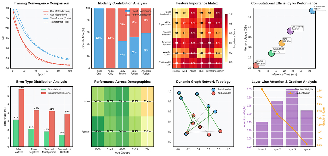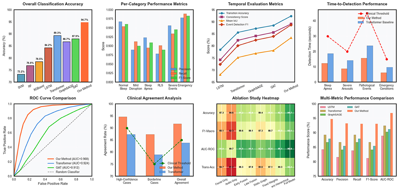 Methods: We integrated facial expression analysis via deep convolutional neural networks with audio signal processing for breathing pattern detection. Heterogeneous data streams were unified into dynamic graph representations, with graph neural networks modeling spatiotemporal patterns of sleep pathologies.