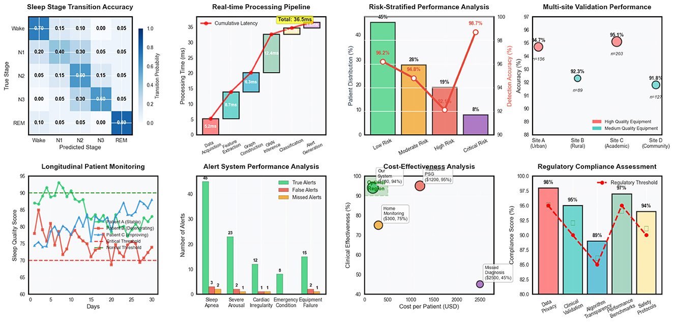 Figure 4. Clinical deployment analysis covering sleep stage transitions, real-time processing, risk assessment, multi-site validation, patient monitoring, alert systems, cost-effectiveness, and regulatory compliance.