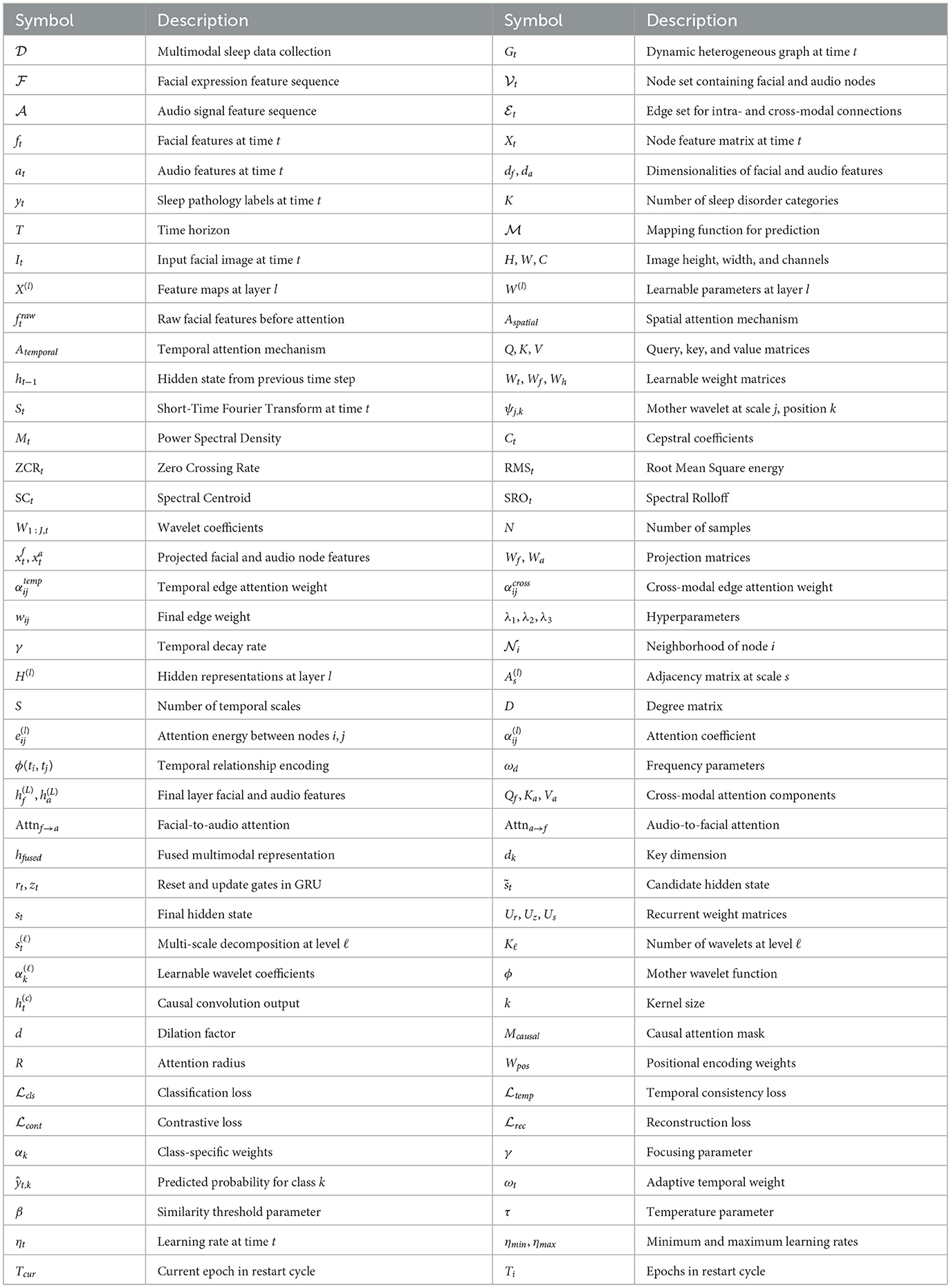 Let us formally define the multimodal sleep monitoring problem as a dynamic graph learning task. We denote the multimodal sleep data as a collection , where represents the sequence of facial expression features and represents the corresponding audio signal features over time horizon T. At each time step t, we have and , where df and da are the dimensionalities of facial and audio feature spaces, respectively in Table 1. The objective is to learn a mapping function that predicts sleep pathology labels at each time step, where K represents the number of distinct sleep disorder categories.