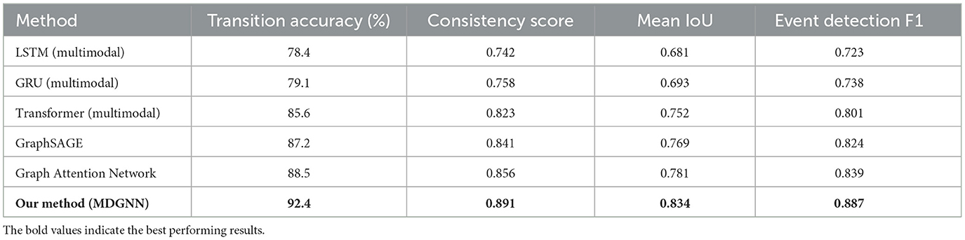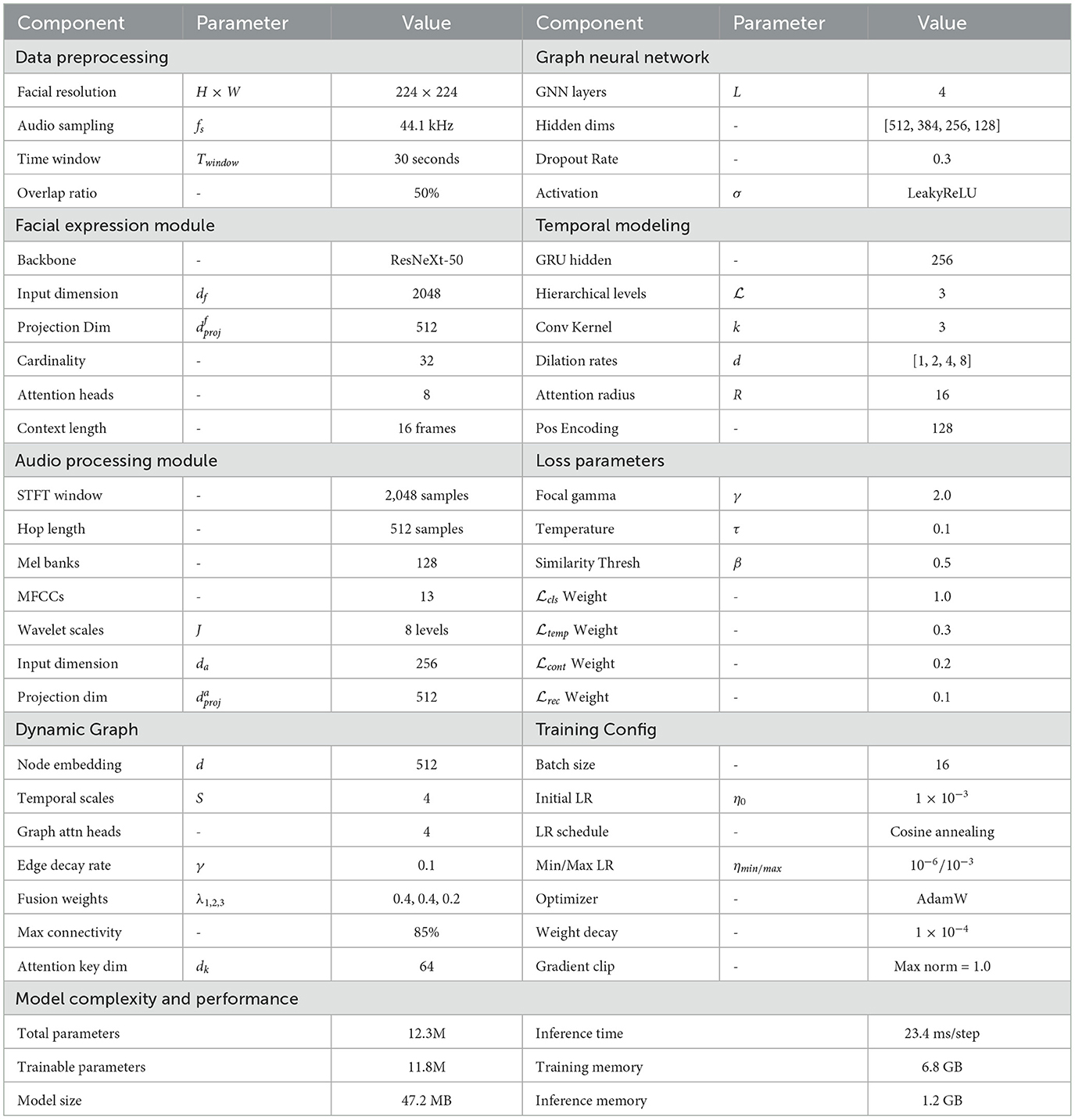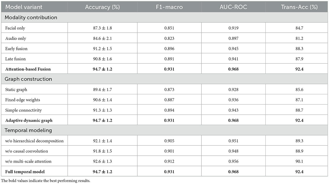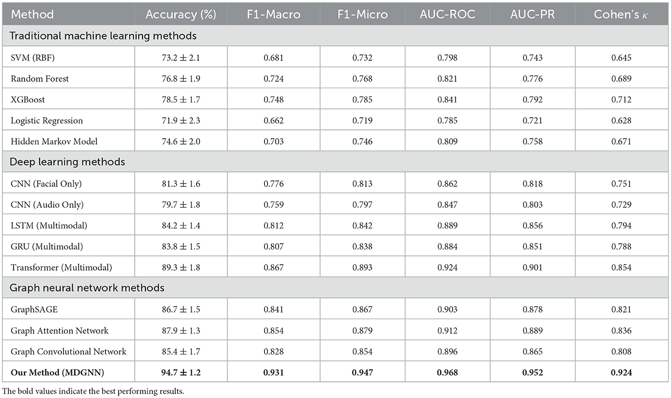 Contemporary deep learning approaches were implemented as stronger baseline methods to provide more rigorous comparative evaluation. Convolutional Neural Networks (CNNs) were applied separately to facial and audio data, followed by late fusion strategies to combine predictions from individual modalities. The CNN architectures included ResNet, EfficientNet, and Vision Transformer variants for facial analysis, and 1D CNN and WaveNet architectures for audio processing. Recurrent neural network baselines included LSTM and GRU networks processing concatenated multimodal features, with attention mechanisms to identify relevant temporal segments (Skibinska and Burget, 2021). Transformer-based models adapted for multimodal time series classification served as state-of-the-art comparisons, incorporating positional encoding schemes suitable for continuous temporal data and cross-modal attention mechanisms. Graph neural network baselines included GraphSAGE, Graph Attention Networks (GAT), and Graph Convolutional Networks (GCN) adapted for our multimodal temporal graph representation. These methods provided direct comparisons to our approach while using simpler graph construction strategies and standard message passing mechanisms without the specialized temporal and cross-modal components of our proposed framework.