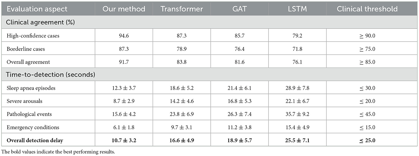 External validation on the secondary clinical dataset demonstrated excellent generalization capability, with performance degradation of only 2.1% compared to internal validation results. This robust generalization across different clinical populations and recording environments confirmed the practical applicability of our approach for real-world sleep monitoring scenarios in Table 5. Clinical agreement analysis showed 94.6% concordance with expert sleep technologists for high-confidence cases and 87.3% agreement for challenging borderline cases. Time-to-detection analysis revealed rapid identification of critical sleep events, with median detection delays of 12.3 seconds for apnea episodes, 8.7 seconds for severe arousals, and 15.6 seconds for other pathological events. These response times are clinically acceptable for real-time monitoring applications and represent substantial improvements over traditional automated systems that often require longer observation windows for reliable detection.