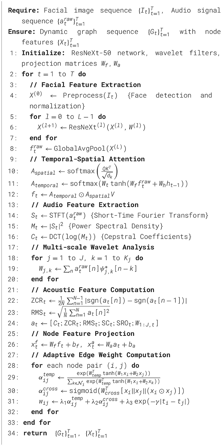 We construct a dynamic heterogeneous graph where represents the node set containing facial and audio nodes, represents edges within and across modalities - is node feature matrix (Chen et al., 2025; Hou et al., 2016). The features are constructed using a projection mechanism where , are projection matrices map different modalities.