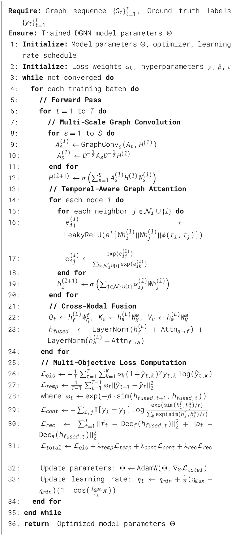 The training of our dynamic graph neural network requires a sophisticated loss function that addresses multiple objectives simultaneously while ensuring stable convergence (Li et al., 2024). Our comprehensive loss function incorporates classification accuracy, temporal consistency, cross-modal alignment, and regularization terms to prevent overfitting and enhance generalization capabilities.