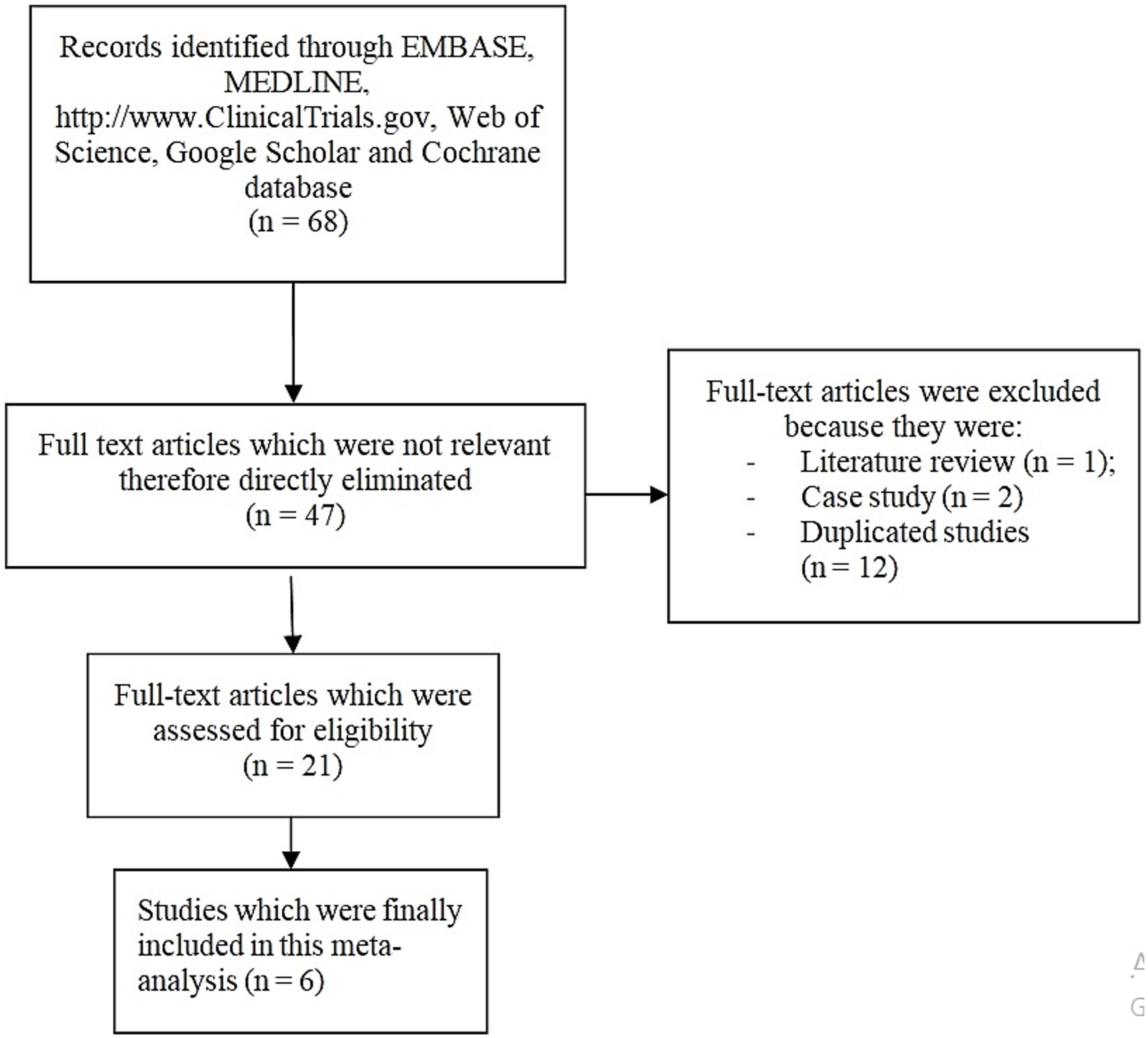 Flowchart depicting study selection for a meta-analysis. Initially, sixty-eight records were identified. Forty-seven irrelevant full-text articles were directly eliminated. Twenty-one articles were assessed for eligibility. Twelve articles were excluded for being literature reviews (one), case studies (two), or duplicates (twelve). Finally, six studies were included in the meta-analysis.