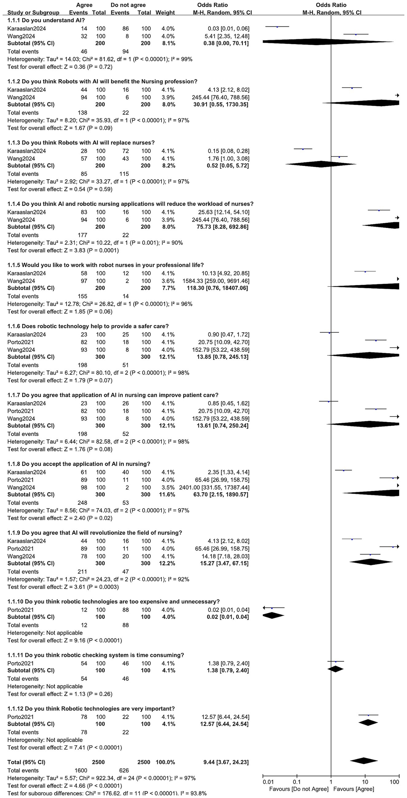 Forest plot illustrating study results on opinions about AI and robotics in nursing. It shows odds ratios with confidence intervals for various questions like understanding AI, robots benefiting the nursing profession, and their impact on workload. Subsections include analysis on AI improving patient care and opinions on robotics being costly or time-consuming. Results are presented with meta-analysis statistics like heterogeneity and overall effect. Each row displays data from different studies, with graphical representation of agreement and disagreement proportions.