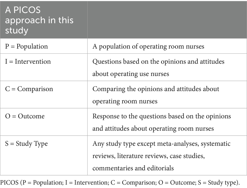 A PICOS (P = Population; I = Intervention; C = Comparison; O = Outcome; S = Study type) approach to this study has been represented in Table 1.