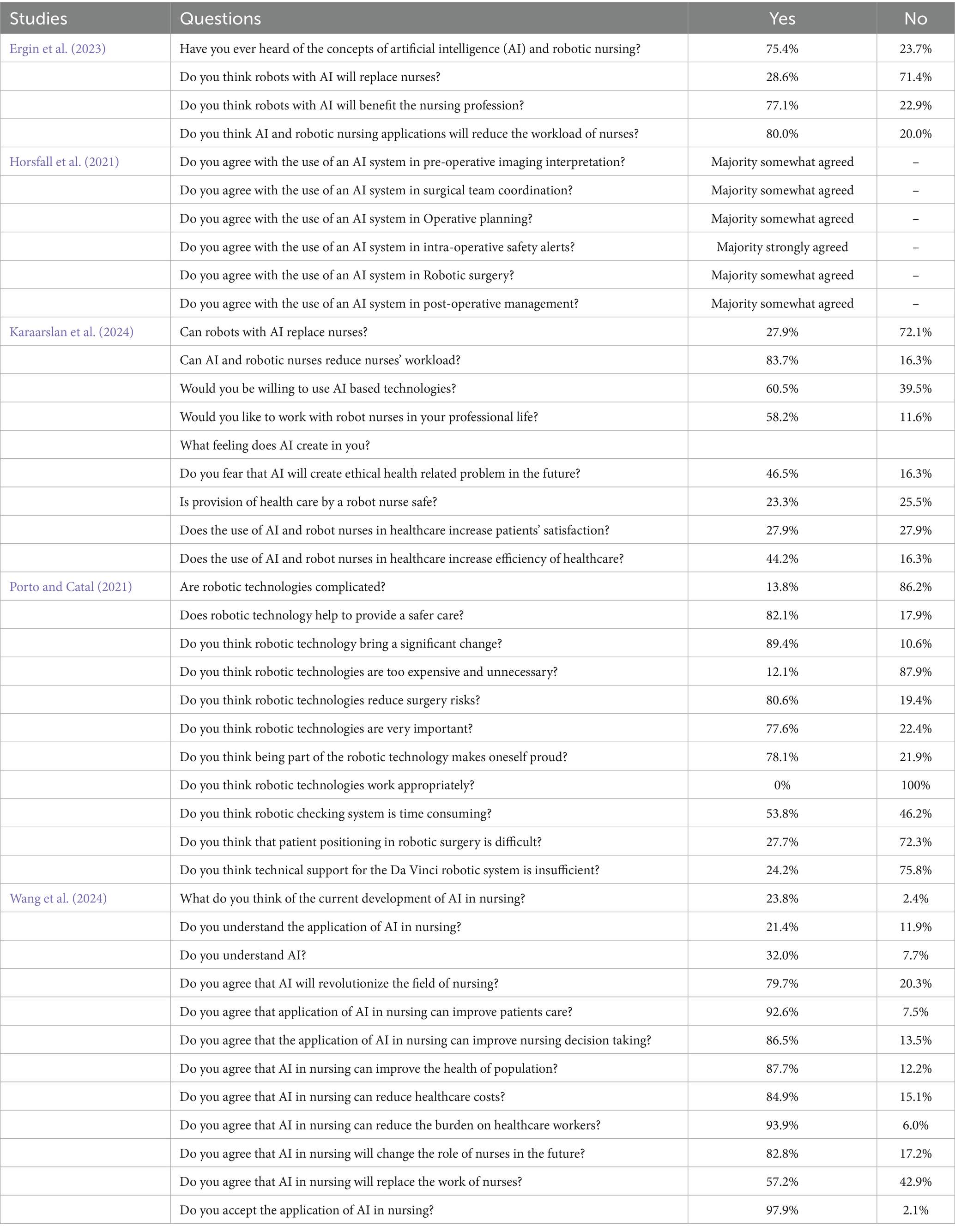 Table 2 showed questions based on artificial intelligence which were asked to the operating room nurses and the percentage of participants who agreed or disagreed to specific questions from the different original studies.