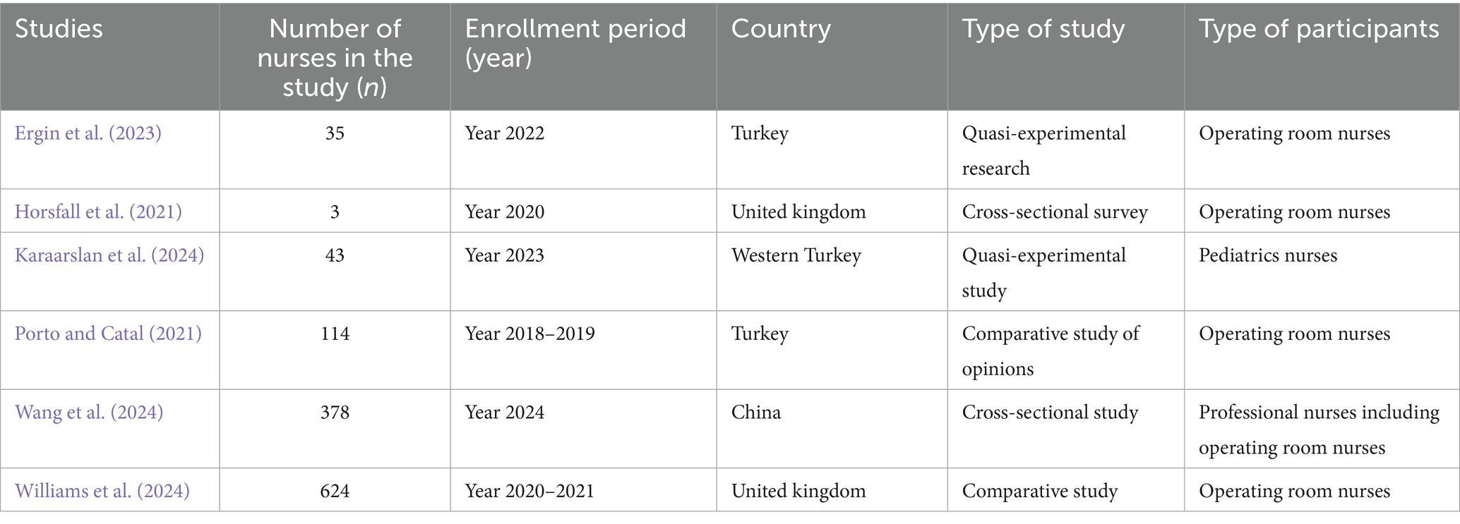 This analysis was based on a total of 6 studies consisting of a total number of 1,197 participants enrolled from year 2000 to year 2024. Participants were extracted from Quasi-experimental research, cross-sectional surveys, and comparative study of opinions including operating room nurses. The countries involved included Turkey, China and the United Kingdom. The main features of the studies have been listed in Table 3.