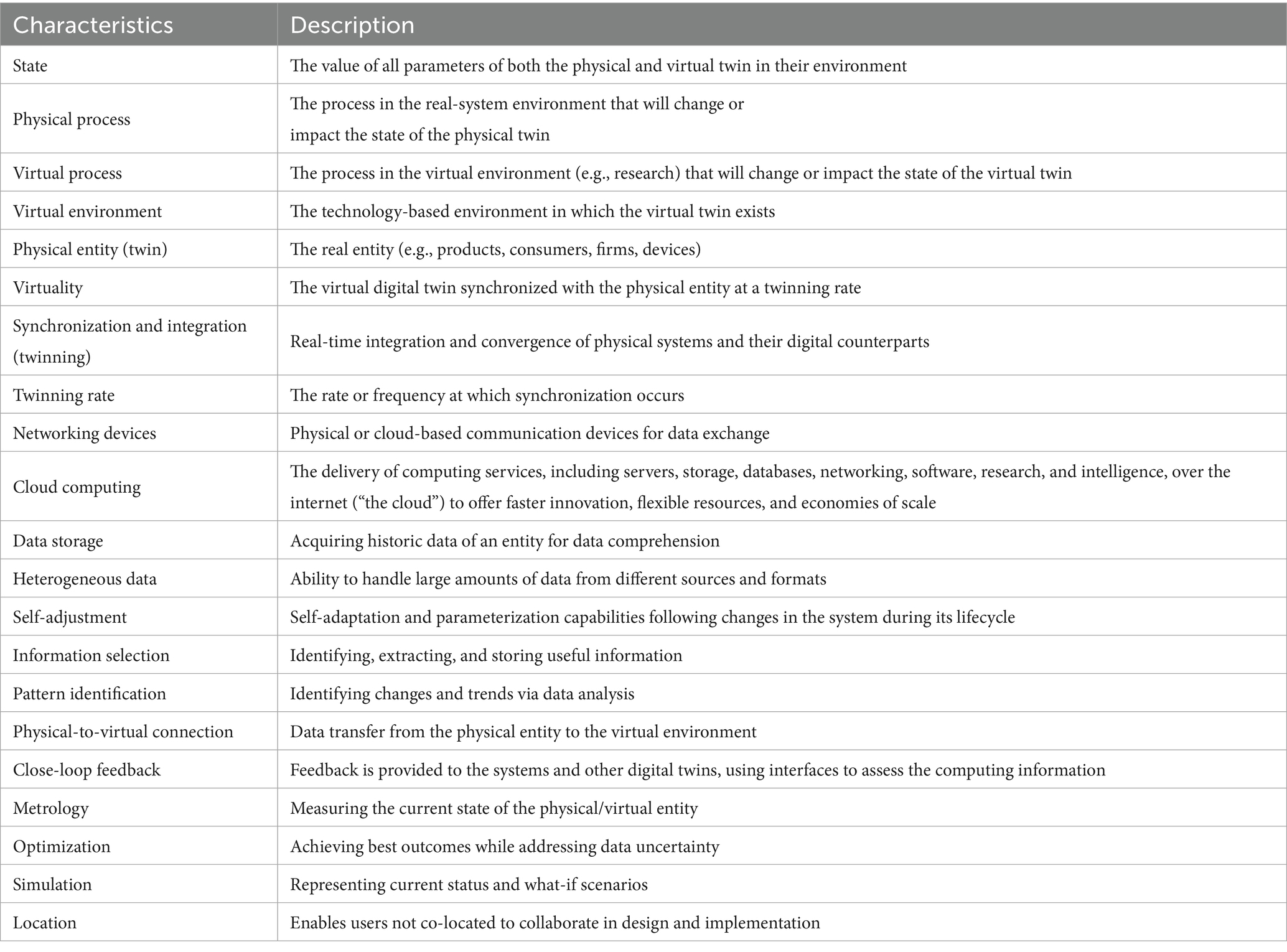 Interactive Digital Twins (IDTs) are designed to significantly enhance human-machine interactions and inter-machine communications by dynamically emulating their real-world counterparts. These systems integrate both raw and processed data to reflect actual conditions accurately. With advanced simulation models, IDTs can monitor and control increasingly complex systems. Furthermore, IDTs are equipped with basic analytical models and software that allow for rigorous analysis and prediction of system conditions under various scenarios. At their most advanced level, IDTs incorporate machine learning models that generate real-time insights, enabling immediate optimization of system performance (Turner et al., 2016). Table 1 summarizes the key characteristics of DTs, while Figure 1 visually illustrates the concept of IDTs. Additional elaborations can be found in Appendix 1.