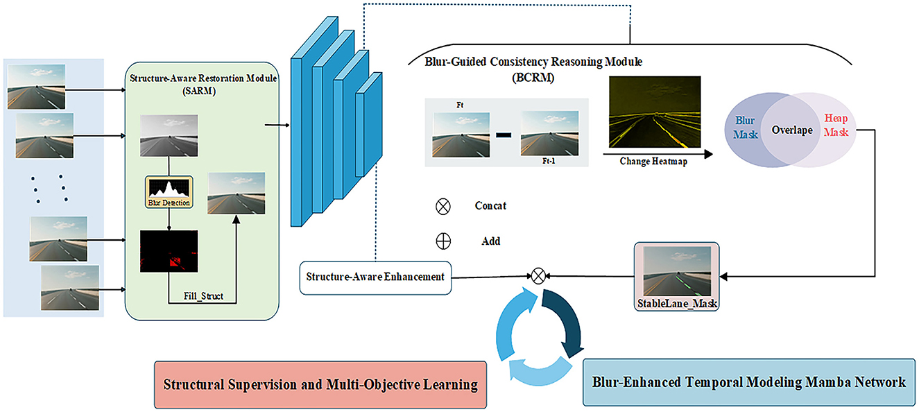 The proposed framework is designed to intelligently handle blurred regions by first verifying structural integrity before committing to restoration and temporal modeling, a key distinction from conventional “restore-then-detect” pipelines. This paper proposes an Inter-frame Stability-Aware Blur-enhanced Mamba Network (StaBle-MambaNet) framework for lane detection, aiming to address the issue of information loss in blurred scenes. The overall architecture is illustrated in the figure and primarily consists of the following modules: (1) Structure-Aware Restoration Module (SARM), which performs blur region detection/restoration and structural completion within these areas; (2) Blur-Guided Consistency Reasoning Module (BCRM), leveraging inter-frame structural discrepancies to infer potential lane regions; (3) Blur-enhanced Temporal Modeling Mamba (BTM-Mamba), implementing cross-frame dynamic modeling of stable structures based on the Mamba architecture; (4) Structural Supervision and Multi-Objective Learning (SSML), employing composite loss functions for joint optimization of lane prediction outcomes. The overall pipeline is illustrated in Figure 2.